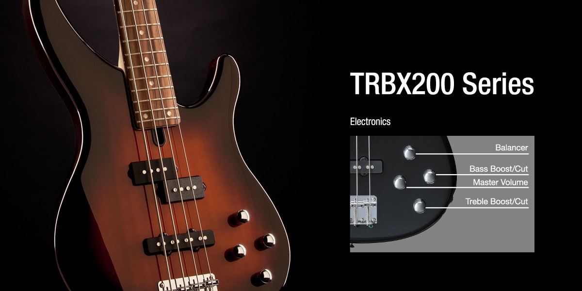 La série TRBX s’adresse aux bassistes à la recherche de polyvalence. Les bassistes s’orienteront vers la nouvelle série TRBX300 essentiellement pour son look et ses possibilités en adéquation avec les sonorités actuelles. Son corps en acajou, le profil de son manche 5 plis et le système exclusif Pre-set EQ offrent une palette sonore incomparable pour un instrument à ce tarif.