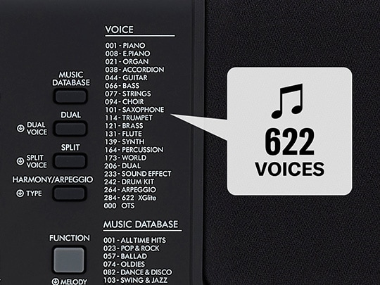 Le PSR-E373 est doté d'un nouveau générateur de son LSI qui améliore sensiblement la qualité sonore ainsi que les effets. Grâce à ce nouveau LSI, vous pouvez profiter d'une bibliothèque complète de 622 sonorités d'instruments parfaites pour jouer dans le style de votre choix, ainsi que pour la première fois sur des modèles de cette catégorie, de la technologie Super Articulation Lite qui reproduit les bruit et les effets naturels des instruments à cordes tels que, par exemple, le violoncelle et la mandoline, auparavant difficiles à imiter, avec un réalisme étonnant, pour des performances authentiques.