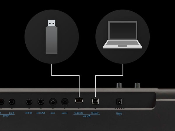 De nombreuses options de connectivité offrent tout le soutien dont vous avez besoin pour vous entraîner, jouer et vous produire. Branchez un microphone pour vous essayer à chanter tout en jouant, utilisez l'application Rec'n'Share pour partager votre musique avec le monde entier, et connectez-vous à des systèmes de sonorisation pour vous produire sur scène.