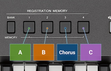You may want to change sound settings for different songs or even during a song while you perform. The Registration Memory setting allows you to recall those stored settings (Voices/Styles/Effects etc) with the push of a button.