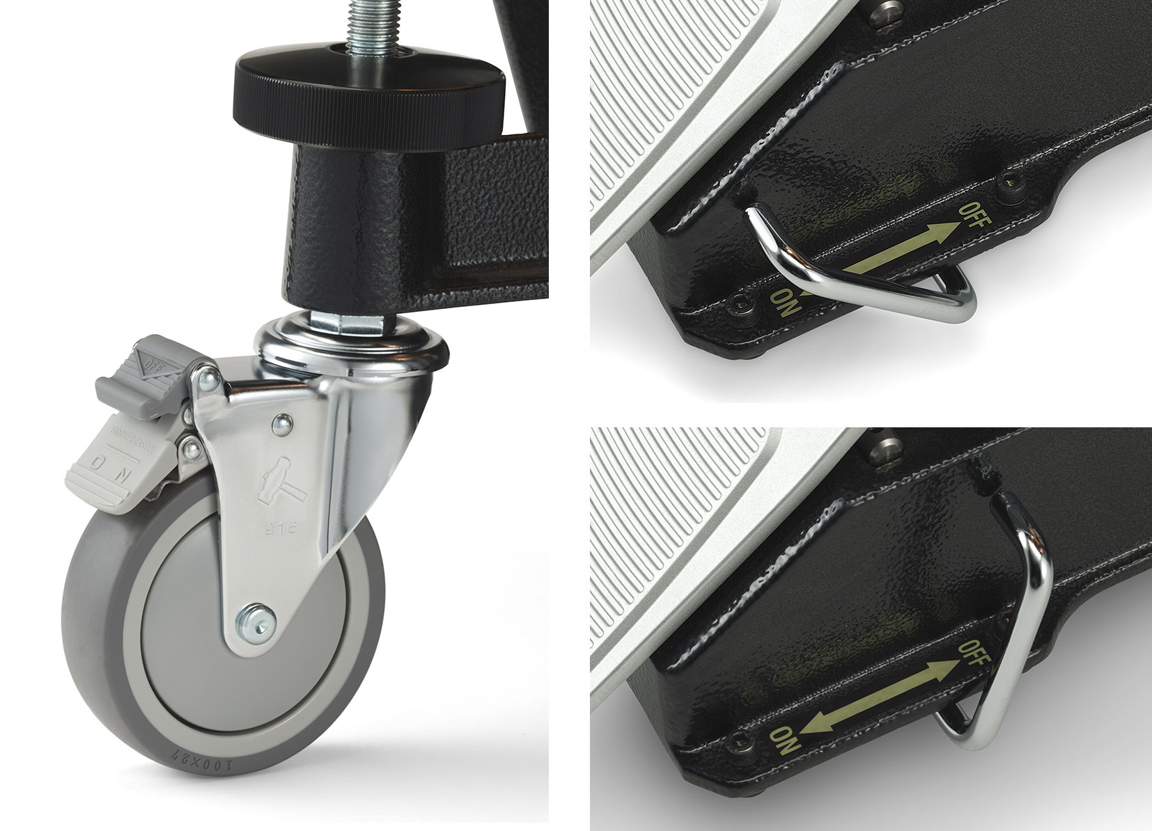 Left: Main caster lock, Right: Pedal caster auxiliary brake