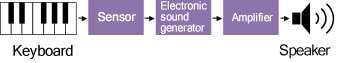 À l’opposé, le Clavinova n’a pas de cordes. Chaque touche est un interrupteur produisant un son prédéfini. Un générateur électronique produit les sons, qui sont ensuite amplifiés à l’aide d’un haut-parleur.
