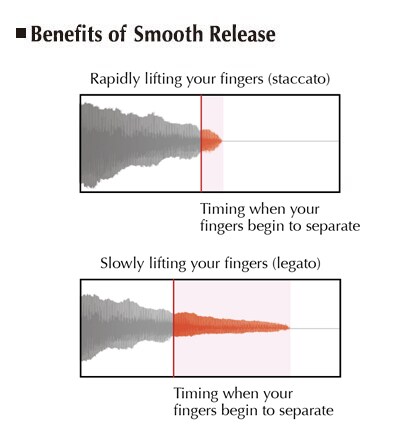 Doté de la technologie Smooth Release Yamaha, le Clavinova reproduit un son court et clair lors d’un jeu rapide en “staccato”, ou bien, à l’inverse, un son progressif et doux lorsque les doigts glissent sur le clavier lors d’un jeu “legato”.