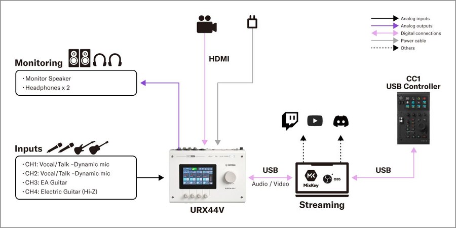 Cette configuration intègre des microphones, des instruments de musique, des appareils de monitoring et des sources vidéo HDMI dans un flux de travail audio-vidéo unifié. L'URX44V gère tous les signaux audio entrants, tels que les voix, les microphones de conversation et les guitares, et envoie le signal mixé à un ordinateur via USB pour le diffuser à l'aide d'un logiciel tel que MixKey ou OBS.