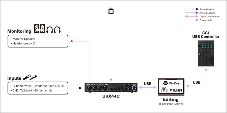 Cette configuration permet de capturer des voix off et des conversations audio de haute qualité via l'URX44C et de les envoyer directement vers des logiciels d'édition tels que MixKey ou Nuendo. Le contrôle du narrateur et de l'ingénieur est pris en charge via des casques et des haut-parleurs de contrôle, garantissant ainsi un enregistrement et une révision précis.