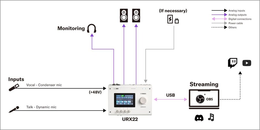 Cette configuration prend en charge les diffusions en direct de chants et de conversations avec l'URX22.