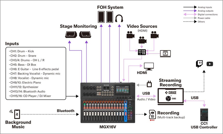 Les sources audio et vidéo HDMI sont regroupées dans un ordinateur connecté via USB pour une diffusion en temps réel, l'audio étant également enregistré dans Cubase. Dans le même temps, une sauvegarde multipiste est enregistrée sur une carte microSD insérée dans le MGX.