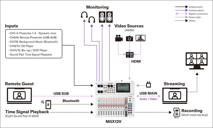 Les modèles MGX-V sont équipés de fonctions avancées de capture HDMI-USB et de transfert HDMI, permettant une intégration transparente de la vidéo haute définition dans les configurations de production vidéo ou de streaming. Ces fonctionnalités puissantes permettent aux utilisateurs de créer un système compact qui gère la sonorisation et le monitoring audio tout en prenant en charge à la fois le streaming et l'enregistrement, ce qui est idéal pour des applications allant des événements live à petite échelle et des concerts hybrides au podcasting et au streaming live.